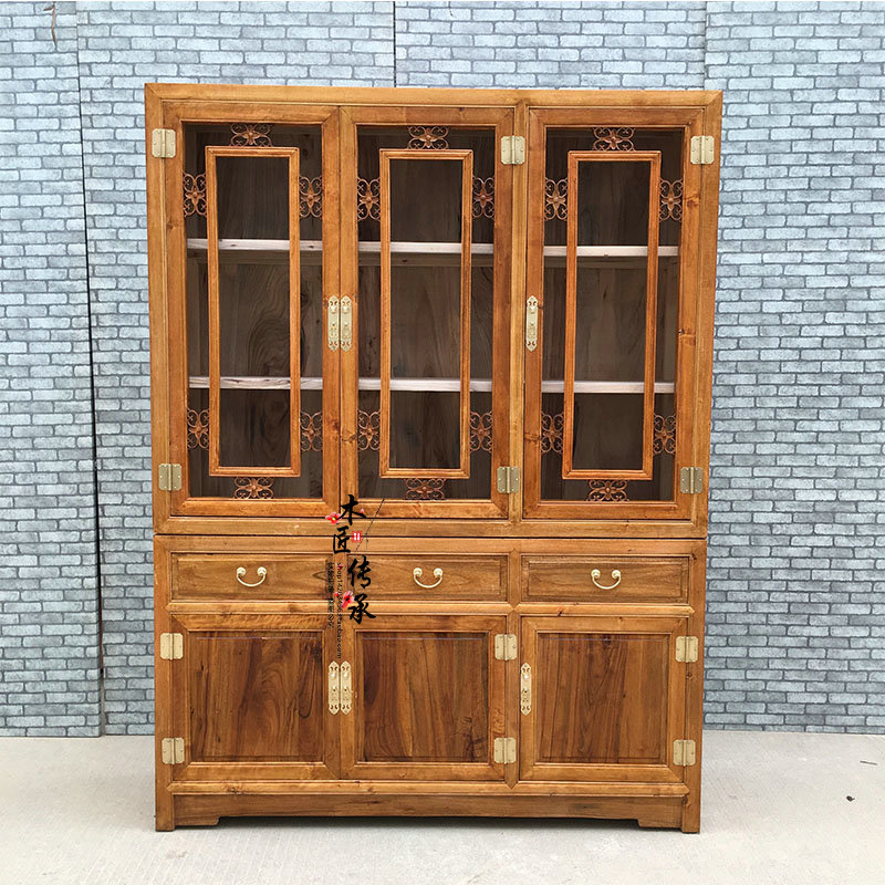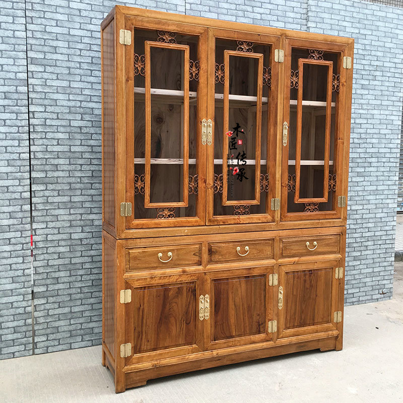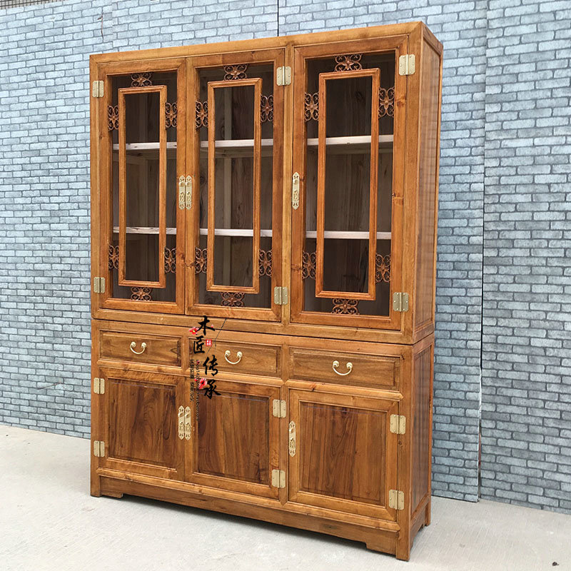 Chinese style bookcase fragrant camphor wood bookcase glass display case imitation ancient containing cabinet Three door carved living room Hyun closed cabinet