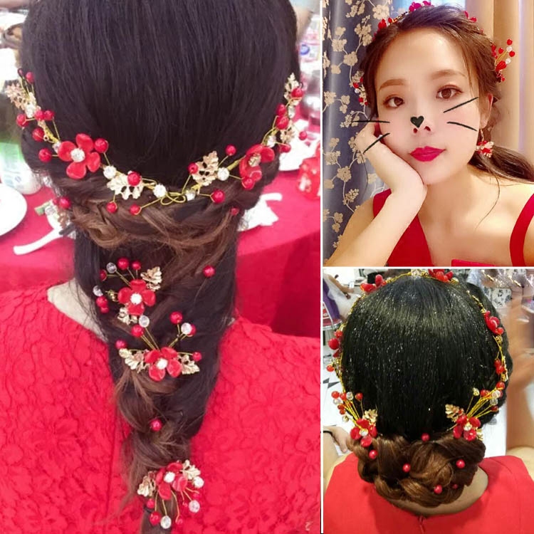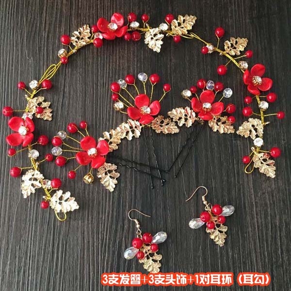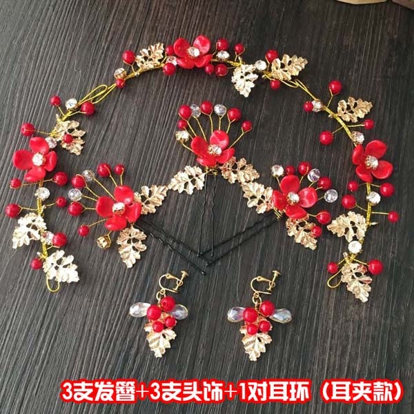 2022 new Korean-style bridal headwear earrings red ornaments Three sets of Chinese wedding toast with flowers and flowers