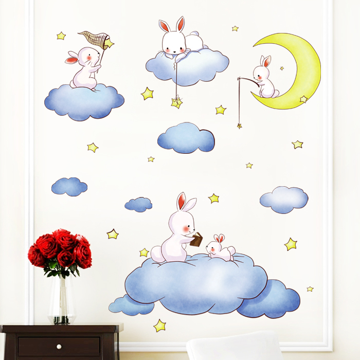 Wall stickers Rabbit sky clouds moon stars baby cartoon children kindergarten classroom early education center decoration stickers