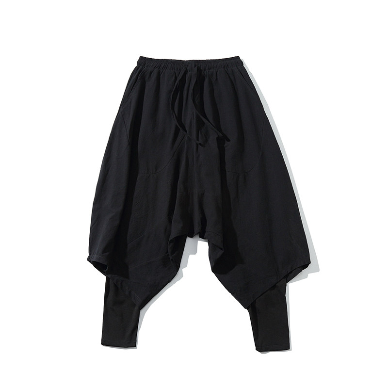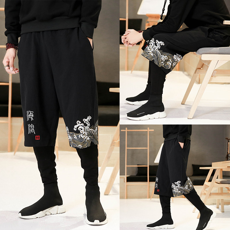 Chinese style men's embroidered fake two-piece men's pants down pants Men's loose Harem pants wide leg bloomers casual pants