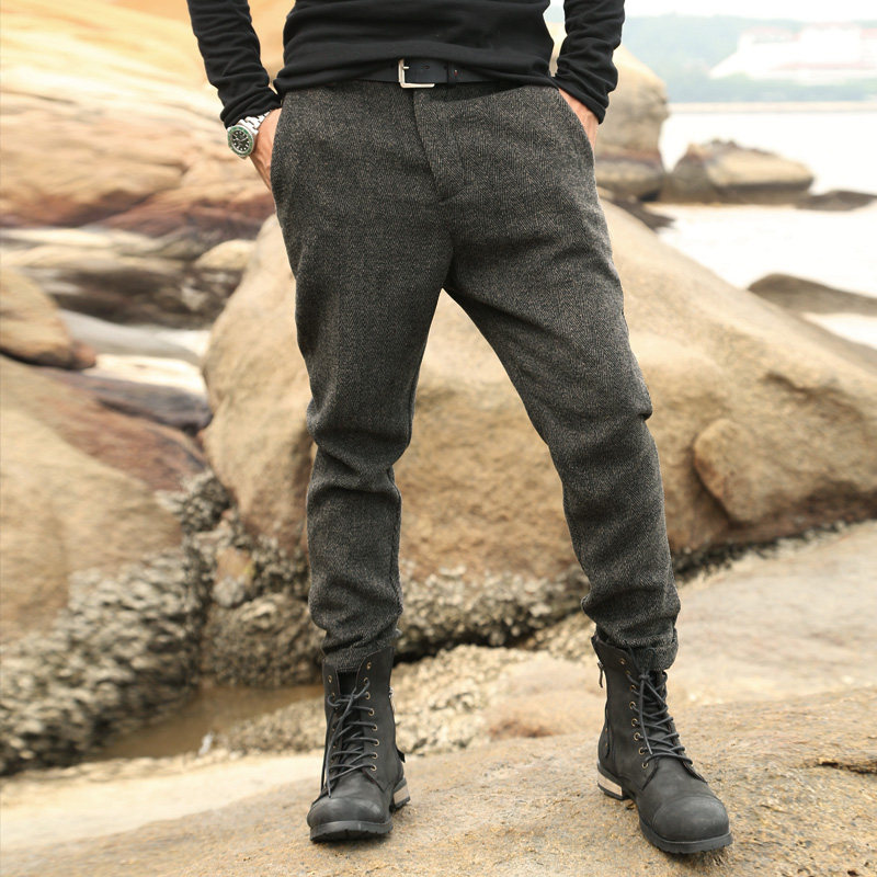 Autumn and winter texture herringbone pattern woolen men's trend casual trousers European and American retro large size slim trousers