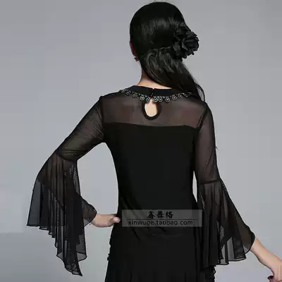 Modern dance clothes Latin square dance long-sleeved women's national standard dance black practice clothes ruffle sleeves handmade nail diamond models