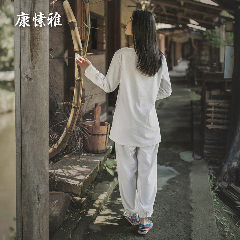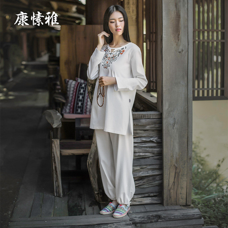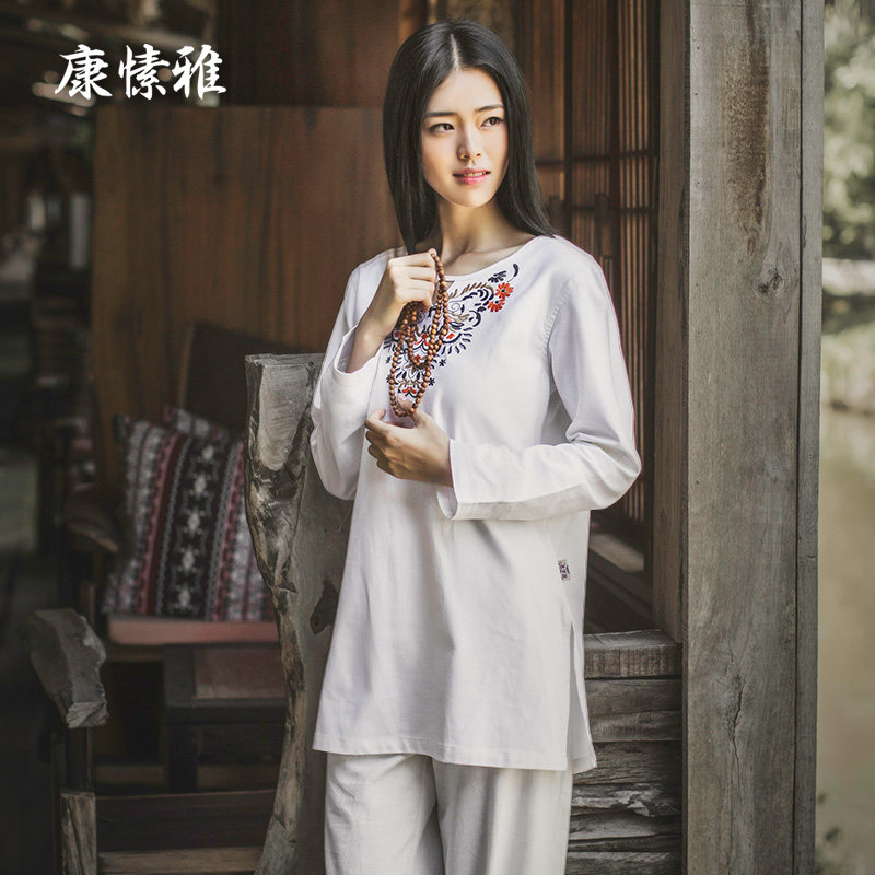 Concian Elegant Cotton Hemp Yoga Suit Suit Woman Summer Zen Willi White Embroidered with Elegant Chinese Style Chinese Style Tea Suit Zen