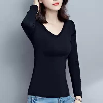Black V-collar interior base shirt women long sleeve autumn and winter 2021 New style V-neck T-shirt tight cotton top