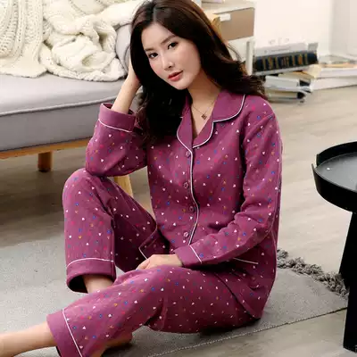 Autumn and winter middle-aged and elderly women's cotton sandwich pajamas Mom long-sleeved thick and thin cotton plus size home clothes set