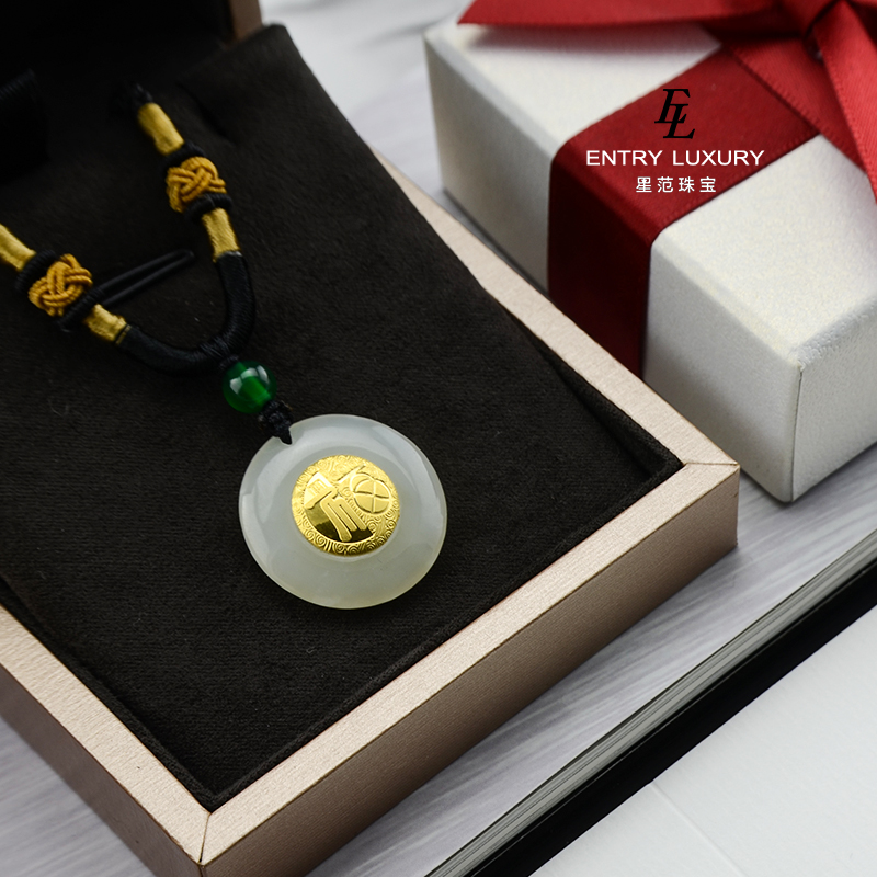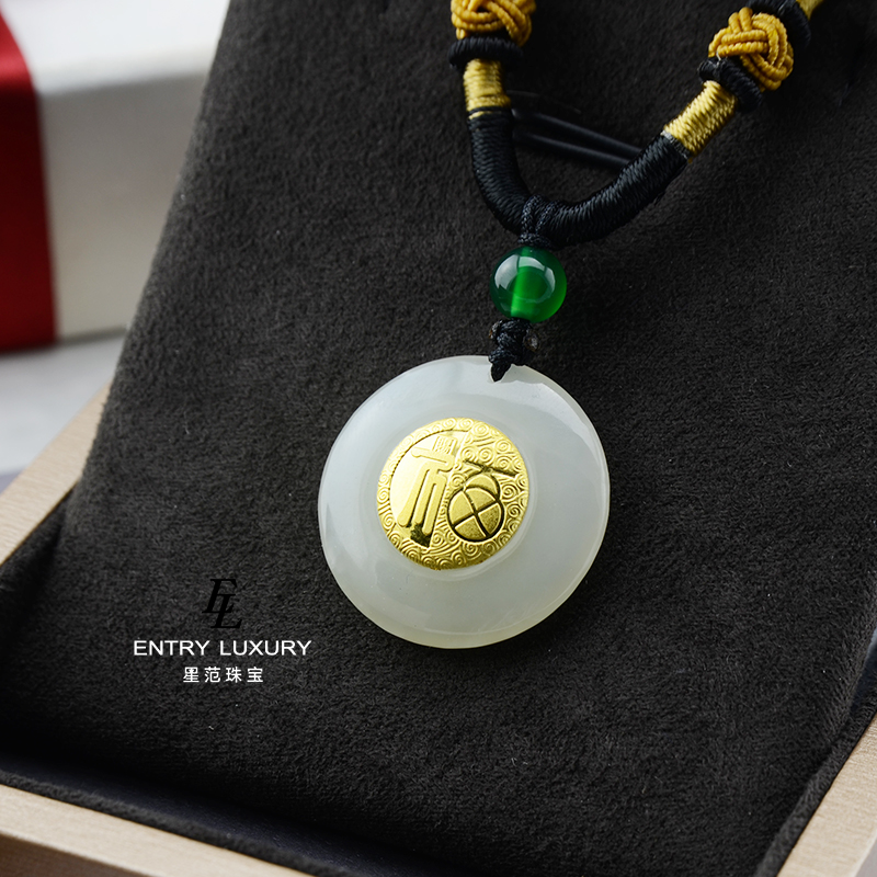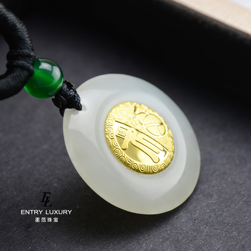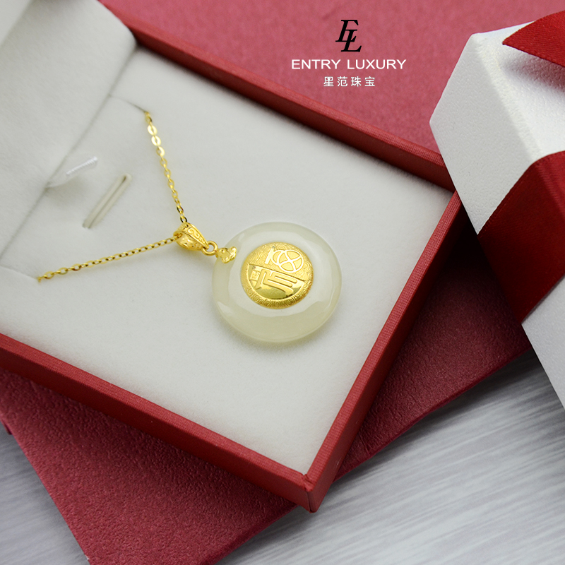 Gold and Tian jade pendant female money chain foot gold fu character gold inlaid jade safe to transfer Pearl girl's birthday present