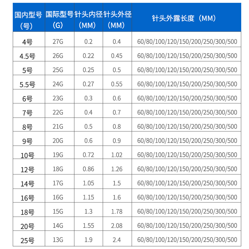 No. 7 No. 22G tube length 500MM Pinmouth 9 20G pipe length 500MM Pinmouth 10 19G pipe length 500MM Pinmouth 12 18G pipe length 500MM Pinmouth 14