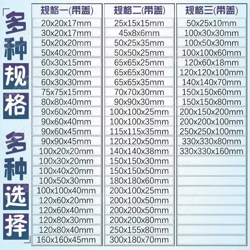 10ml with lid (50x20x20mm) 5ml with lid (30x20x17mm) 16ml with lid (60x30x15mm) 20ml with lid (60x30x20mm) 22ml with lid (100x20x20mm) 25ml with lid (50x40x20mm) 35ml with lid (60x30x30mm) 35ml with lid (100x30x20mm) 50ml with lid (100x40x20mm) 57ml with lid (75x75x15mm) 75ml with lid (90x60x20mm) 3.5ml with lid (20x20x17mm) 90ml with lid (120x60x20mm) 110ml with lid (100x50x30mm) 165ml with lid (90x60x40mm) 185ml with lid (80x80x40mm) 190ml with lid (120x60x40mm) 200ml with lid (90x60x45mm) 205ml with lid (120x80x30mm) 260ml with lid (120x80x40mm) 300ml with lid (90x90x45mm) 300ml with lid (100x100x40mm) 800ml with lid (160x160x45mm) Other specifications see the table on the detail page