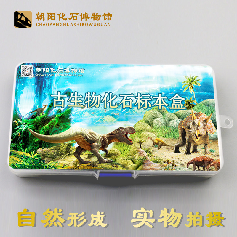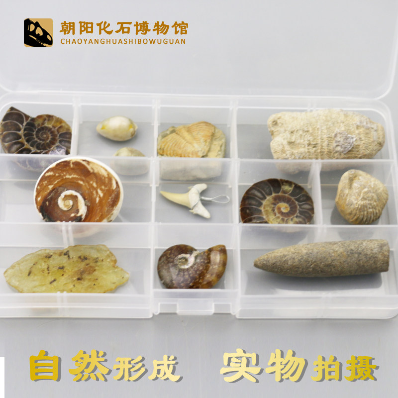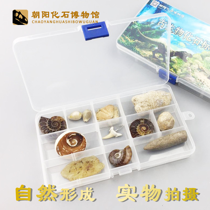 Natural 10 kinds of paleontological fossil herbarium box, trilobite fossil, amber rough stone, odd stone, stone children's gift