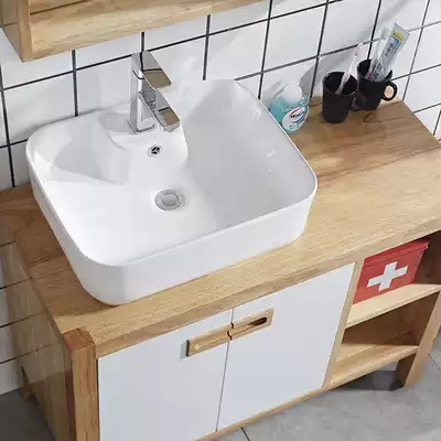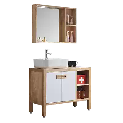 Simple Japanese-style log color solid wood bath cabinet combination floor-to-ceiling bath cabinet Nordic powder room washstand customization