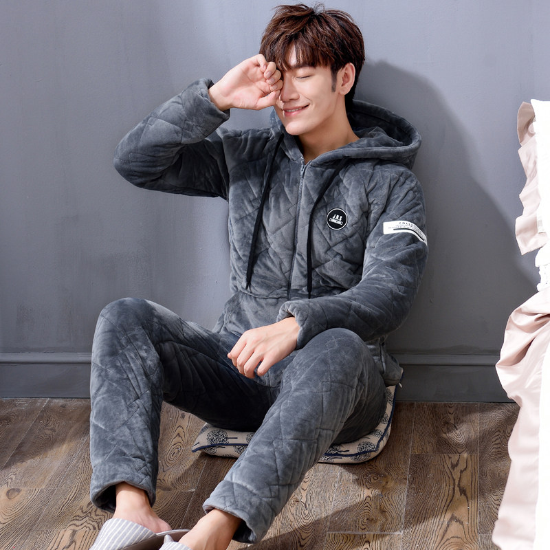 Men's Sleeping Clothes Autumn Winter Thickened gushed coral suede laminated cotton three-layer Liancap Racelet can be worn outside the home Suits Suit