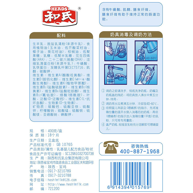 (Manufacturer straight hair)He's Nordic Shanneng infant probiotic formula Domestic Goat milk powder 1 section 400g*12