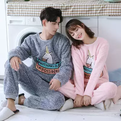 Coral velvet couple pajamas autumn and winter cute thickened cartoon flannel long hair men's and women's winter home service suit