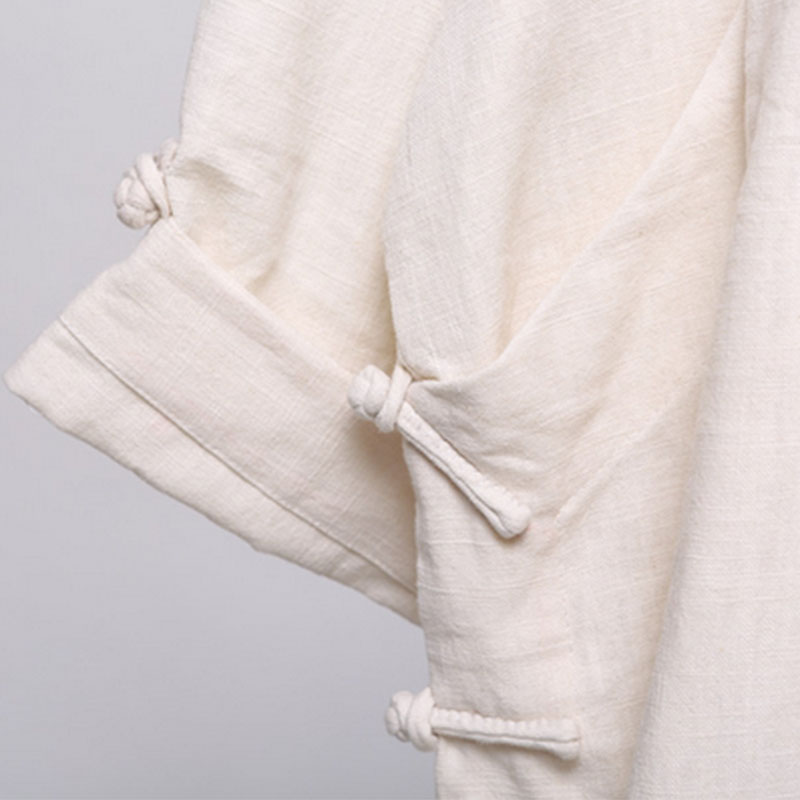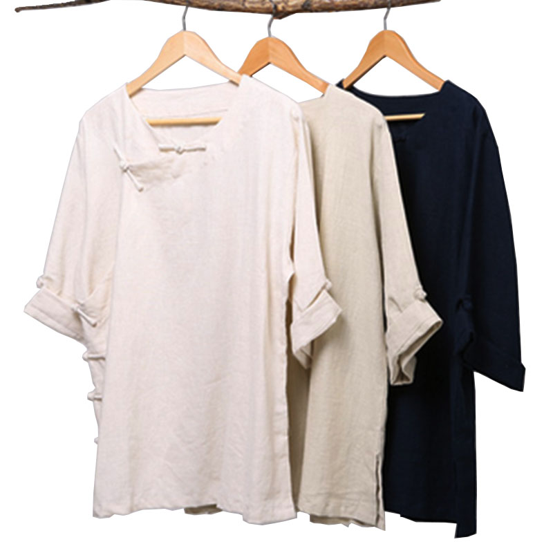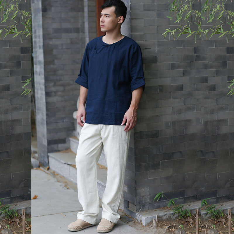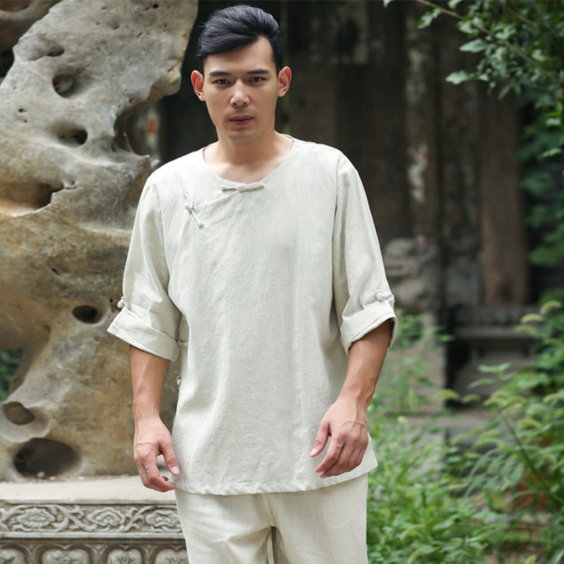 Chinese style linen men's round neck Tang suit T-shirt Chinese style retro button three-quarter sleeve ethnic style Hanfu men's top