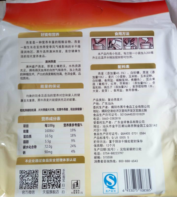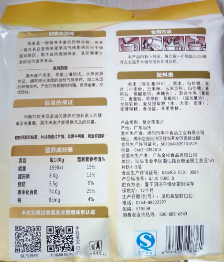 Oats (added 45%)White sugar Rye whole milk powder Mixed fruits and vegetables Apple jujube Banana grape Strawberry Pumpkin seeds, etc