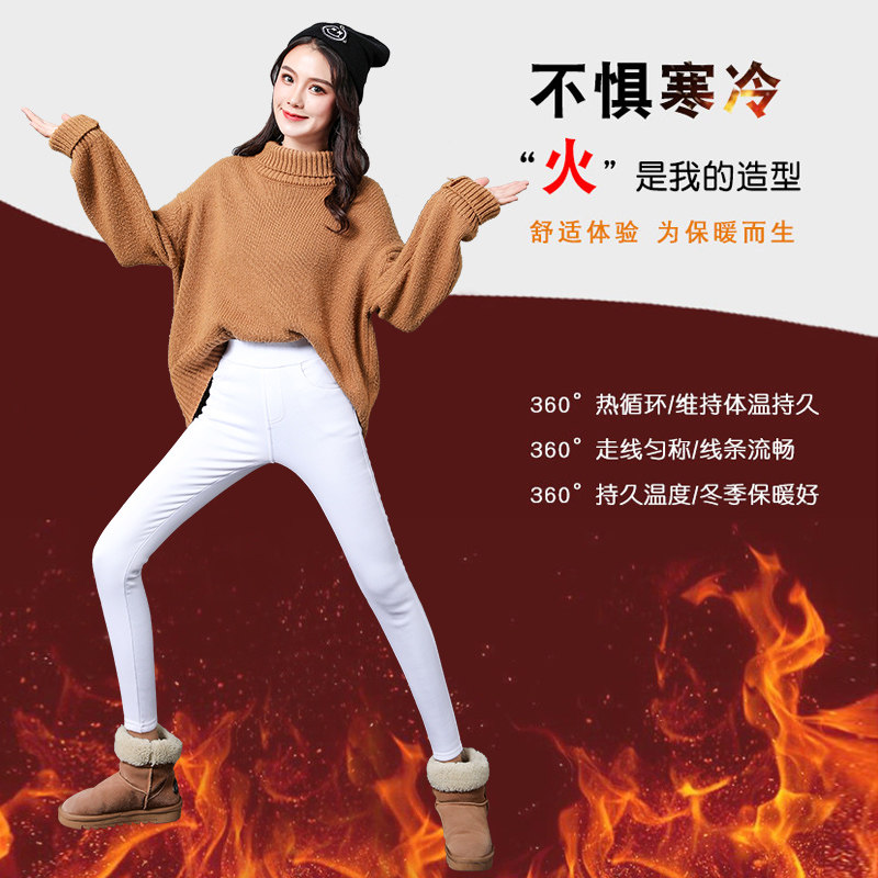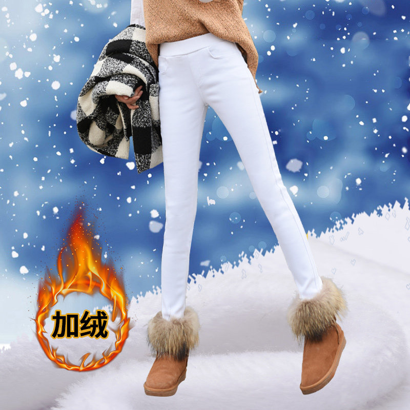 2020 new white pants women wear high waist autumn and winter plus velvet warm padded feet pencil cotton pants nine points