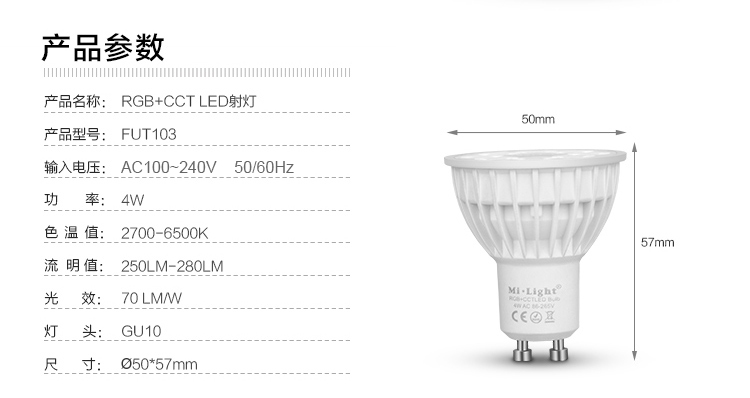 FUT103 GU10 RGB+CCT Spotlight milight Spotlight WIFI LED Lamp 4W Lamp Cup