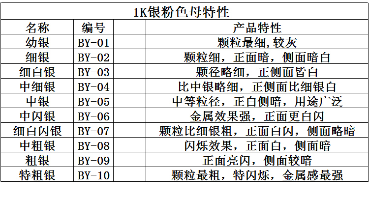 Diamond silver, fine silver, fine silver, fine silver, fine flashing silver, fine silver, fine white flashing silver, medium silver, medium silver, medium flashing silver, medium coarse silver, coarse silver, extra coarse silver, coarse flashing silver 1K resin (color control agent)