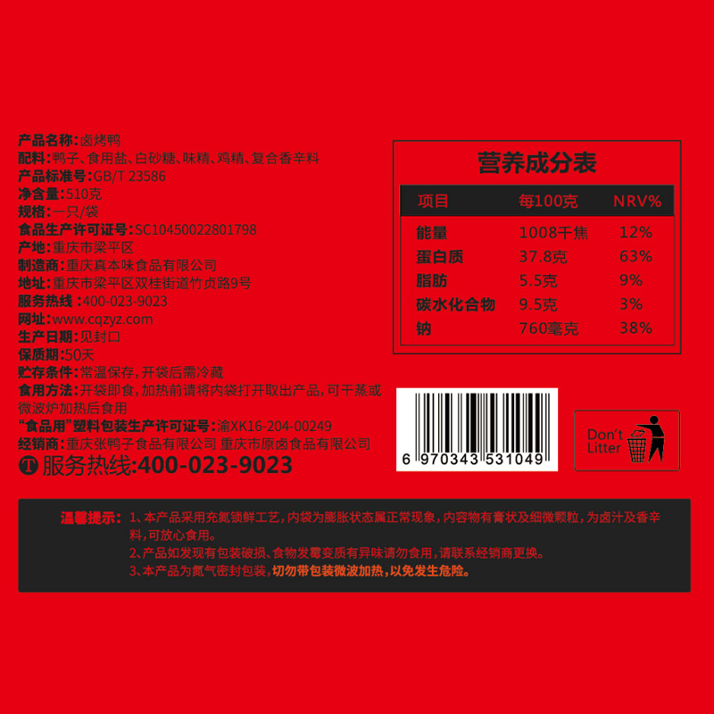 Locked fresh halogen roasted duck 500g