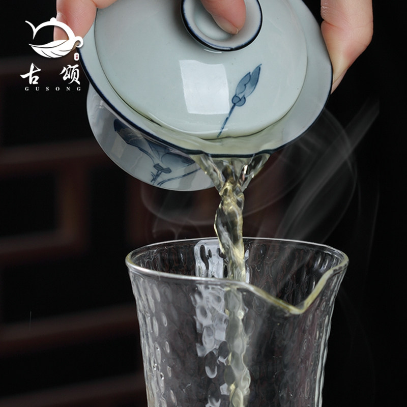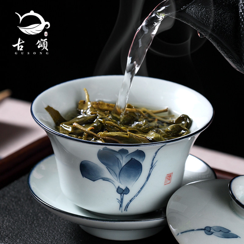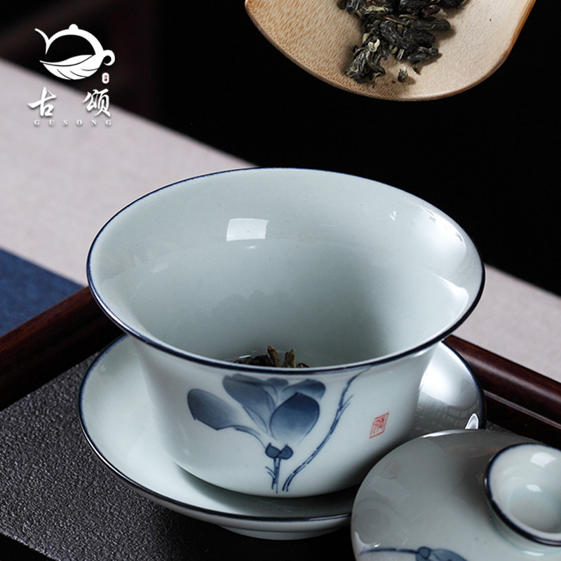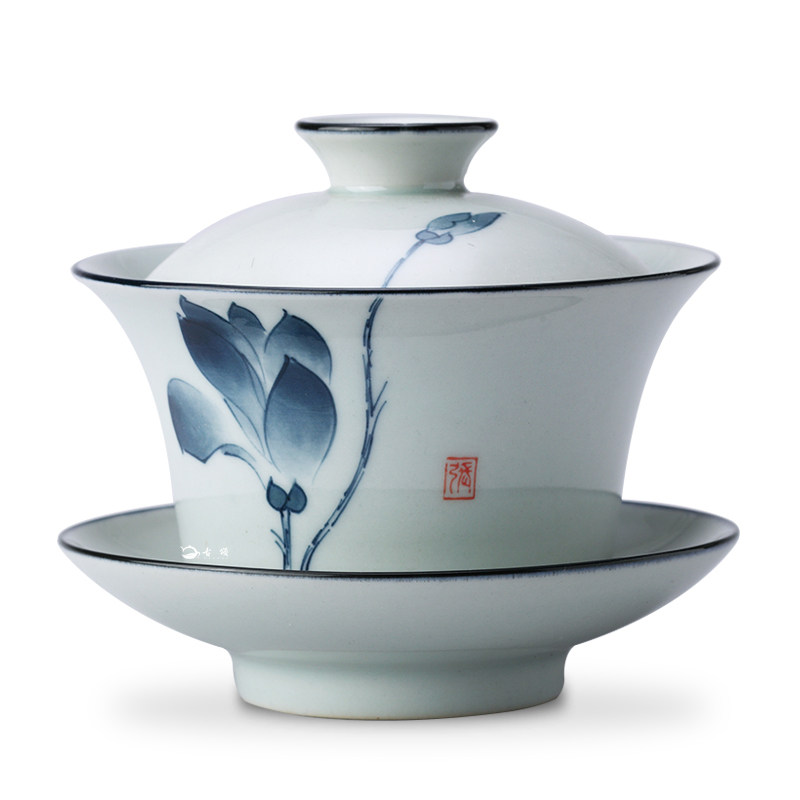 Guzhong cover cup of tea cup Blue ceramic tea bowl kunfu teapot white pot matte triple suit grab pot