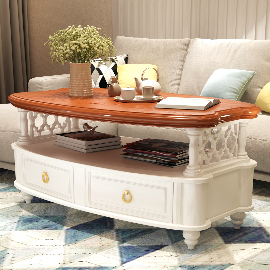 (Gorgeous openwork coffee table) Red-brown oak (gorgeous openwork coffee table) Pure white oak style matching side table needs to be purchased together
