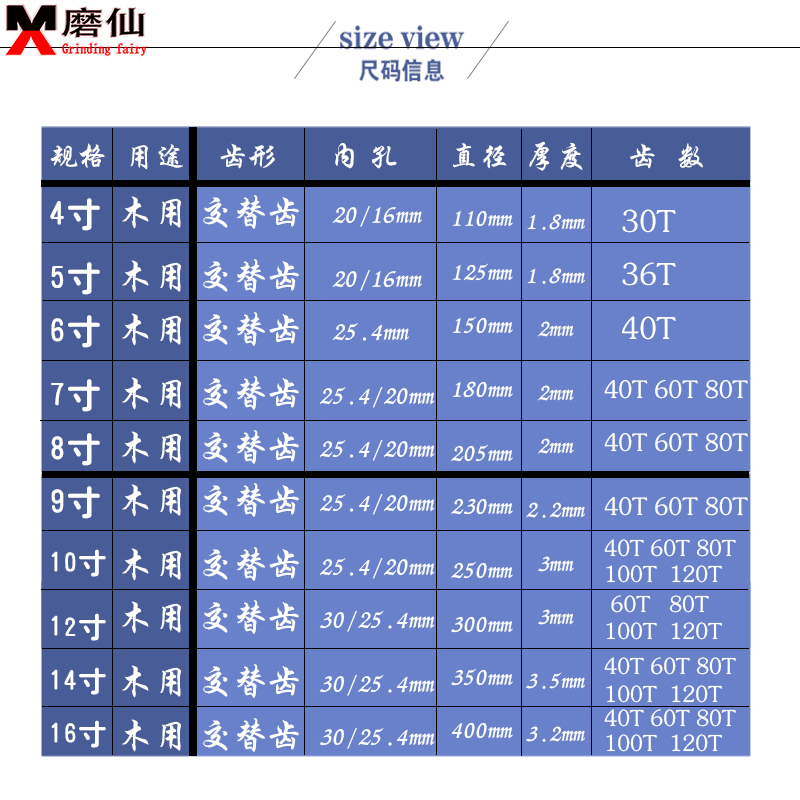 Woodworking general purpose 4 inch X30 teeth X20mm Wood 5 inch X36 teeth X20mm Multi-purpose 5 inch X40 teeth X20mm Wood 6 inch X40 teeth X25 4mm