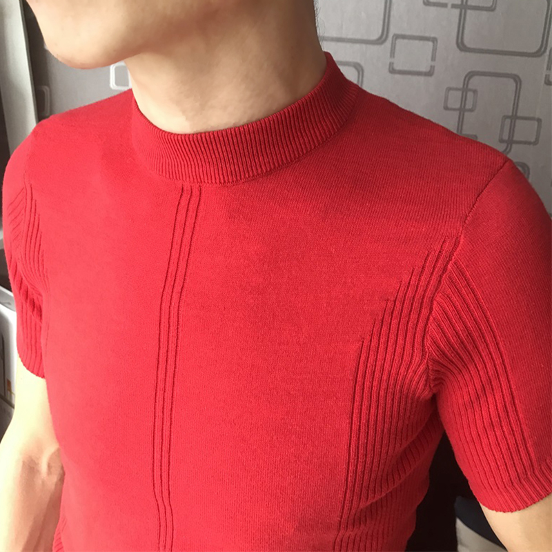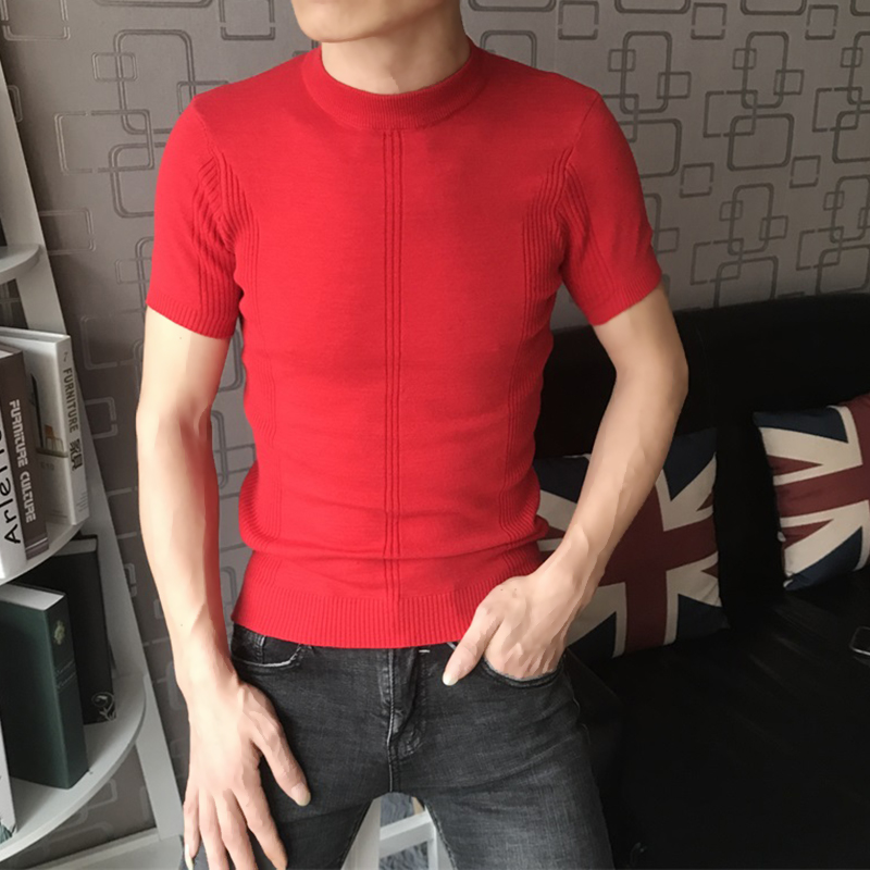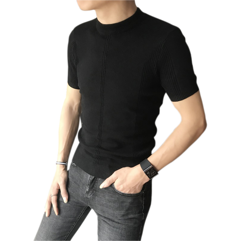 Summer Ice Silk round neck short sleeve T-shirt men's middle turtleneck sweater autumn winter solid color half sleeve slim base shirt tide