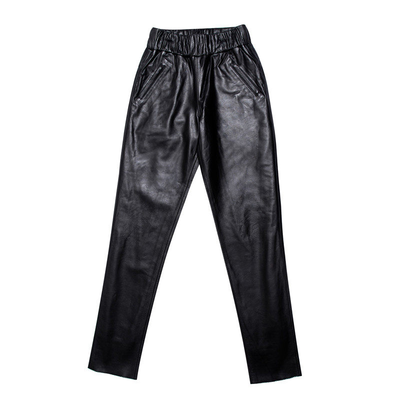 Baona Qiqi pure cowhide trousers women slim high waist leather leather pants 2021 autumn and winter new cigarette pipe pants pencil pants