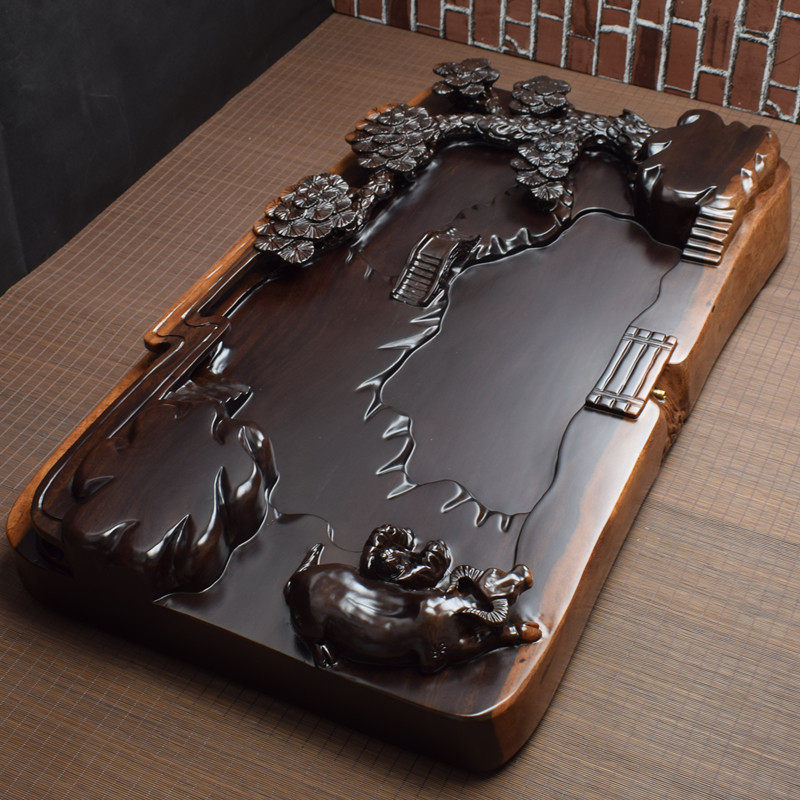 Whole piece of ebony tea tray solid wood pine and cypress zhi kung fu tea set tea sea tea tray large drainage carved