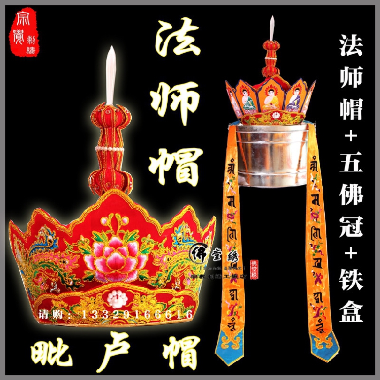 Soft embroidered Tang hat will pure hand-made golden red Pelu Hat Buddha Hat with five Buddha Crown iron box