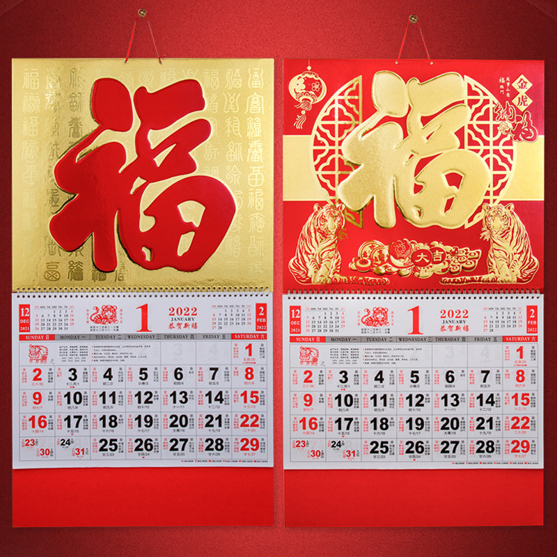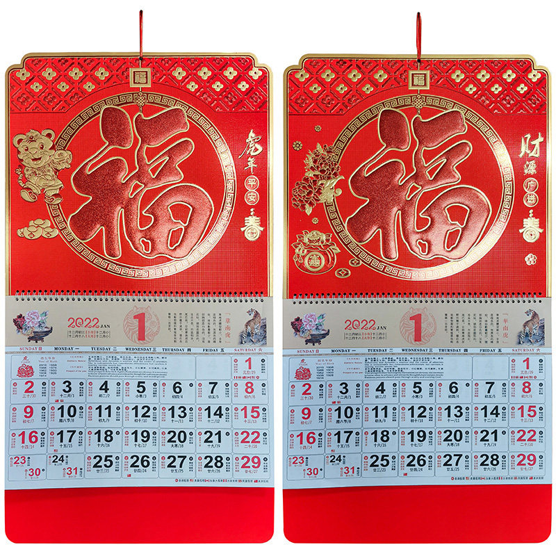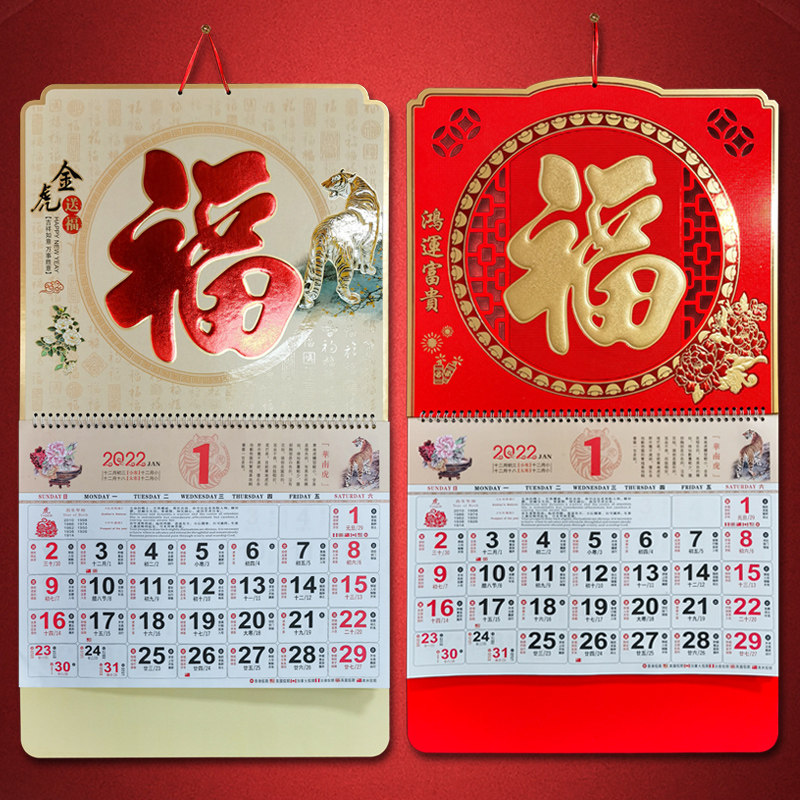 2022 thickened large six open gold leaf hanging calendar to make calendar advertisement bronzed lunar calendar Custom tiger year fu character hanging card