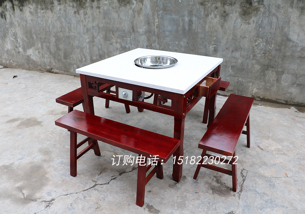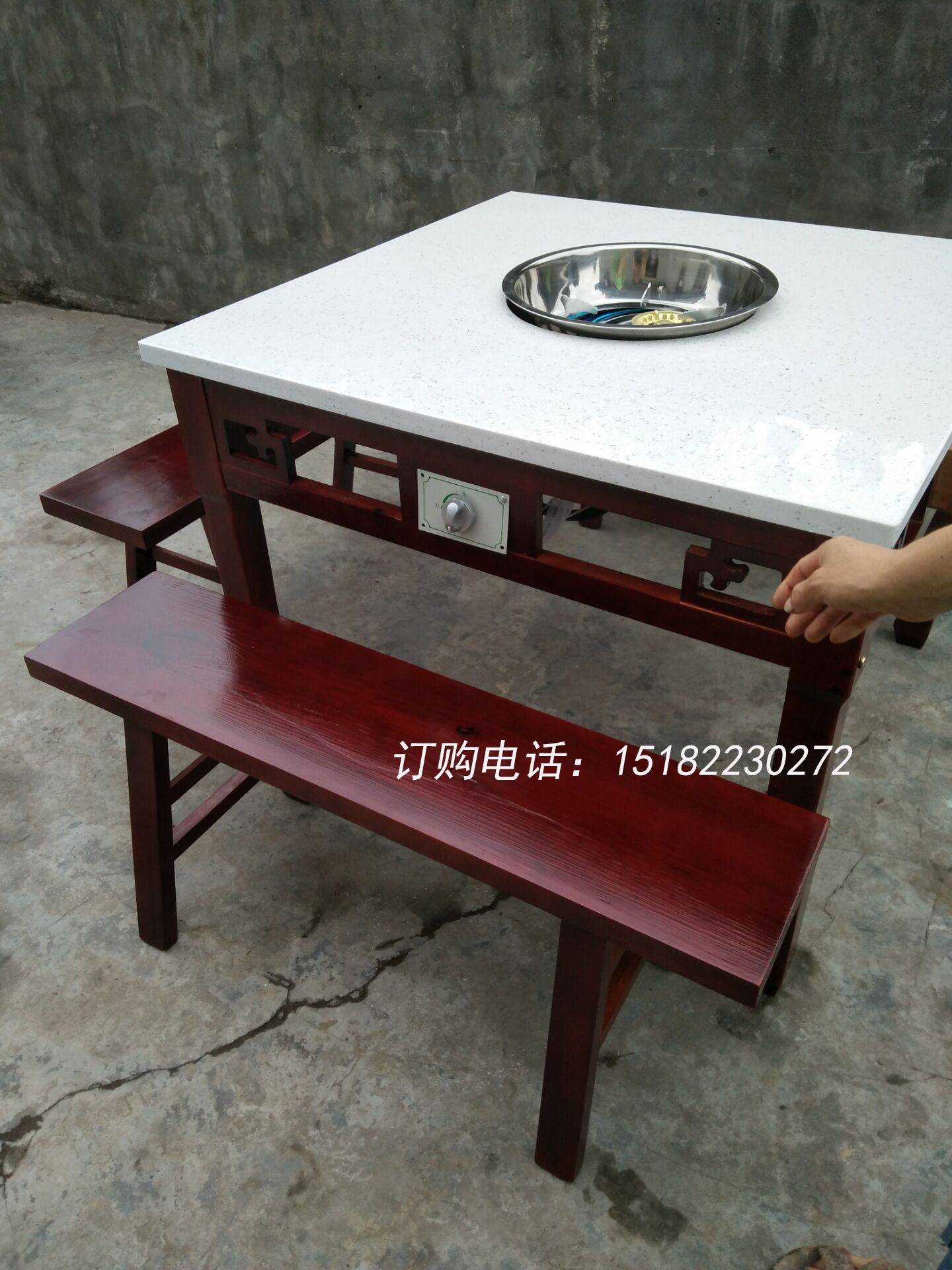 Solid wood marble hot pot table and chair combination induction cooker gas stove hot pot table antique carved hot pot round table