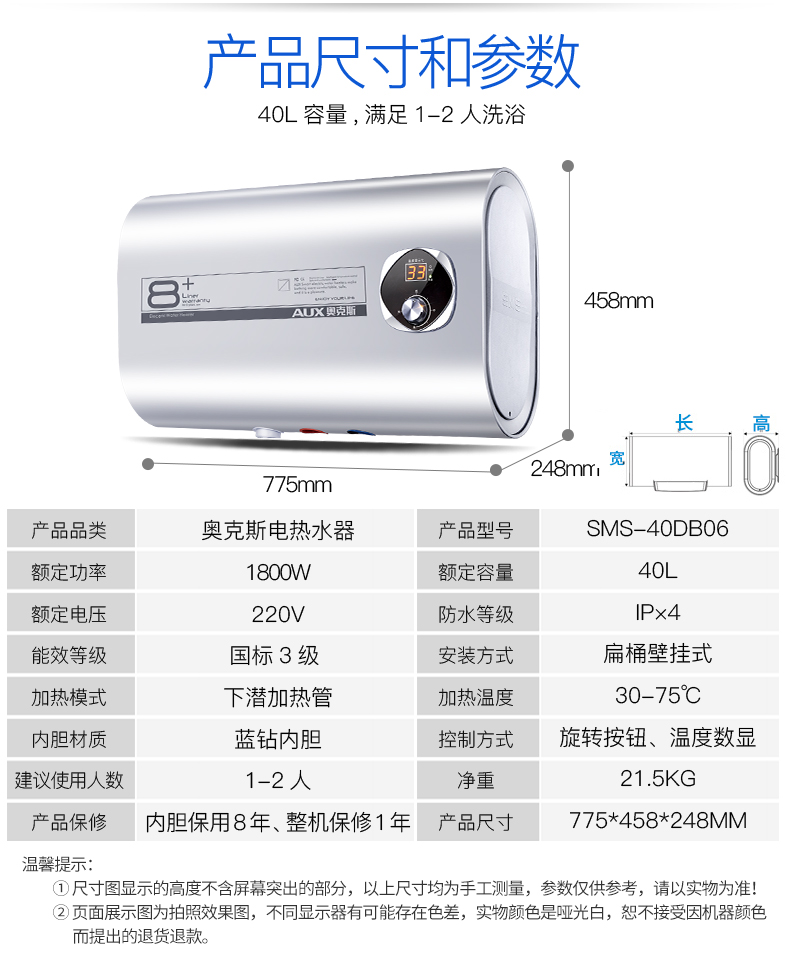 AUX SMS-40DB06 Electric water heater Flat bucket Ultra-thin household water storage type 40 liters L bath shower