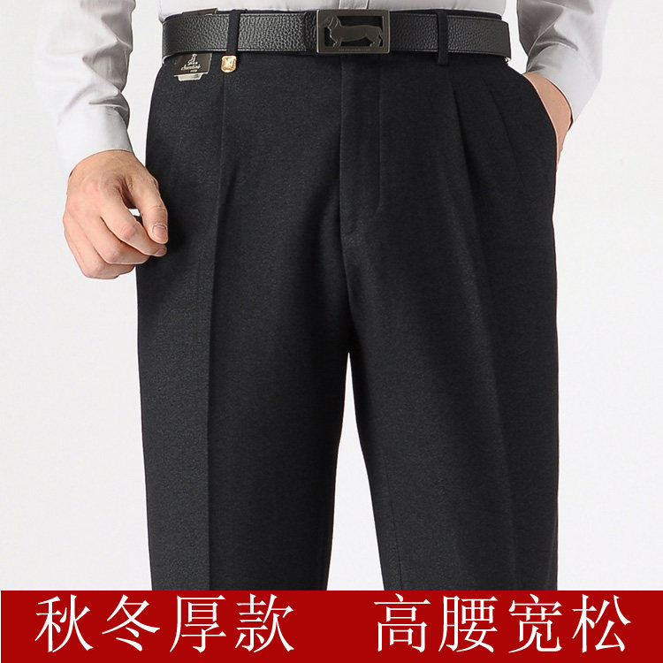 Autumn and winter thick section woodpecker free ironing trousers men's middle-aged single double pleated high waist business straight loose suit pants