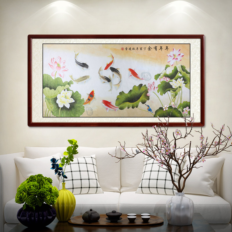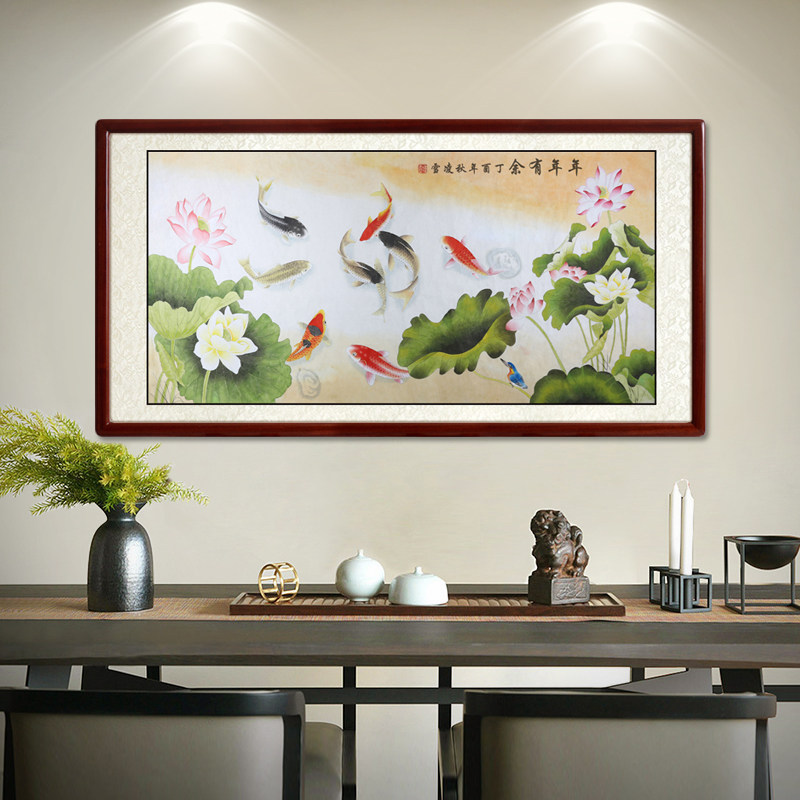 Shang De Tang hand-painted Chinese painting Lotus nine fish figure banner painting calligraphy and painting Living room dining room decorative painting Carp calligraphy and painting hanging painting