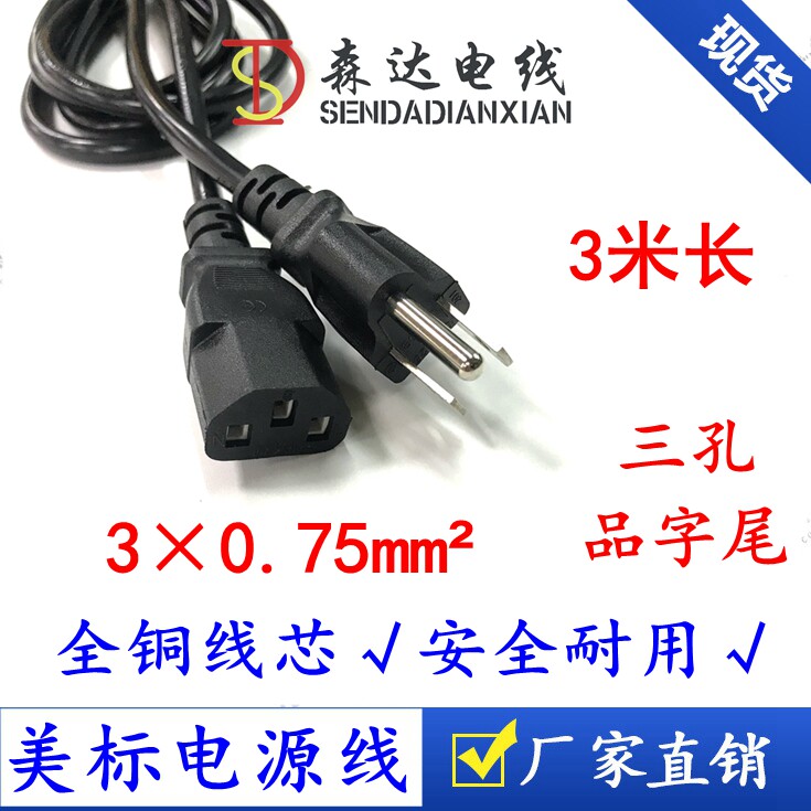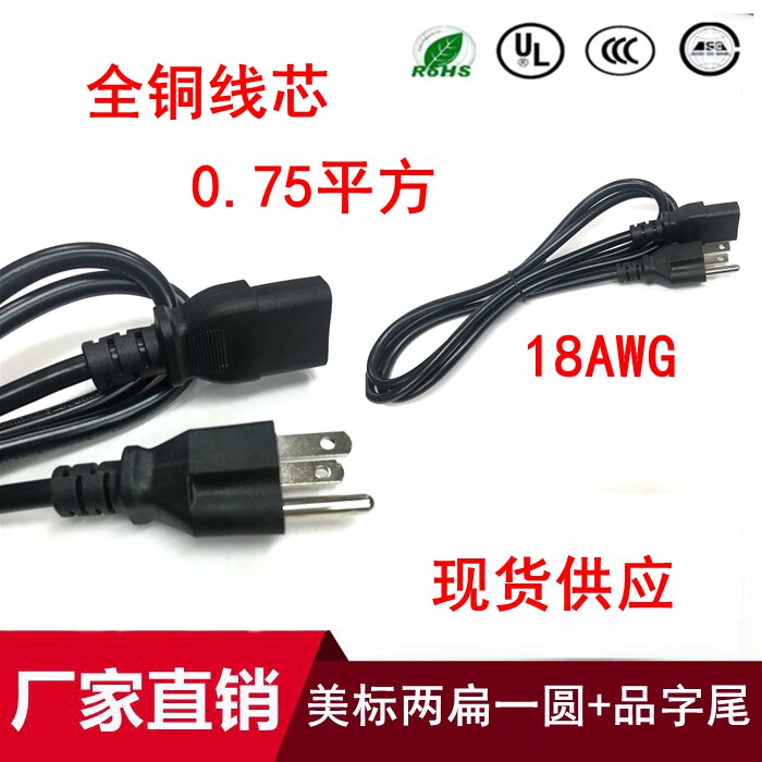 American regulation American three-plug product suffix power cord pure copper 3-core 0 75 square American plug line 1 5 1 8 3 meters