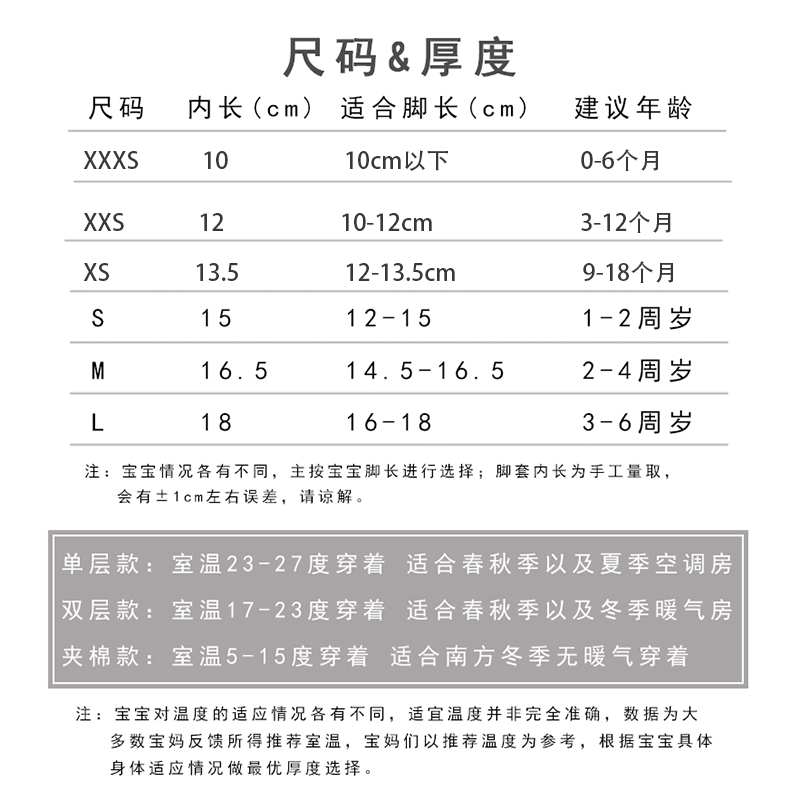 XXXS (0-6 months) XXS (3-12 months) XS (9-18 months) S (1-2-year-old half) M (suitable for 2-4 years old) L (suitable for age 3-6
