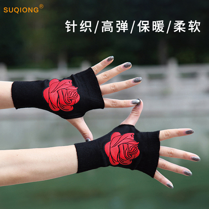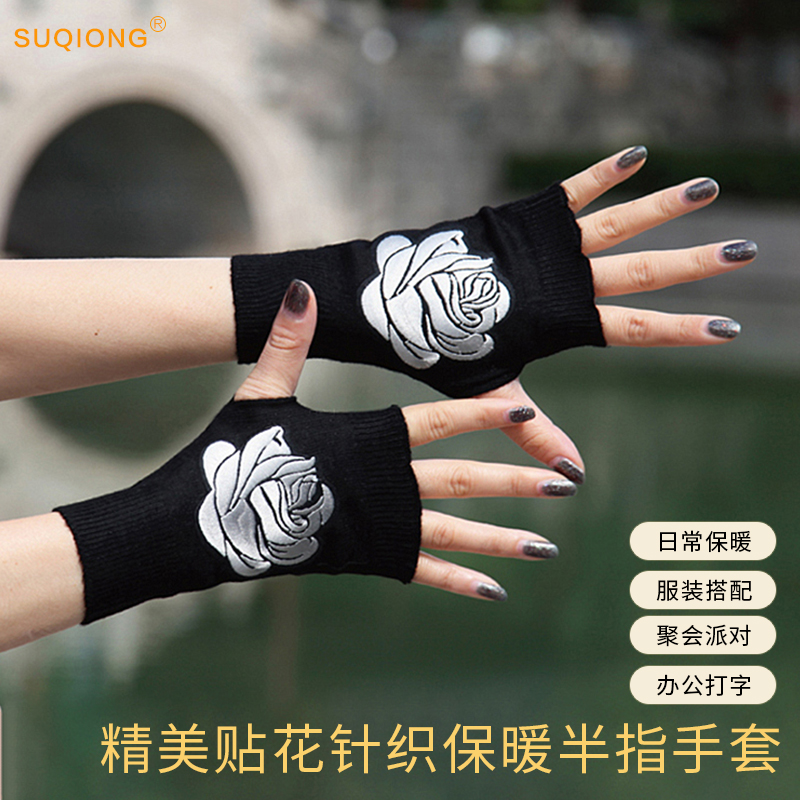 Exquisite appliqued wool cashmere half-finger gloves Women's tight thick high elastic winter warm student writing half-cut gloves