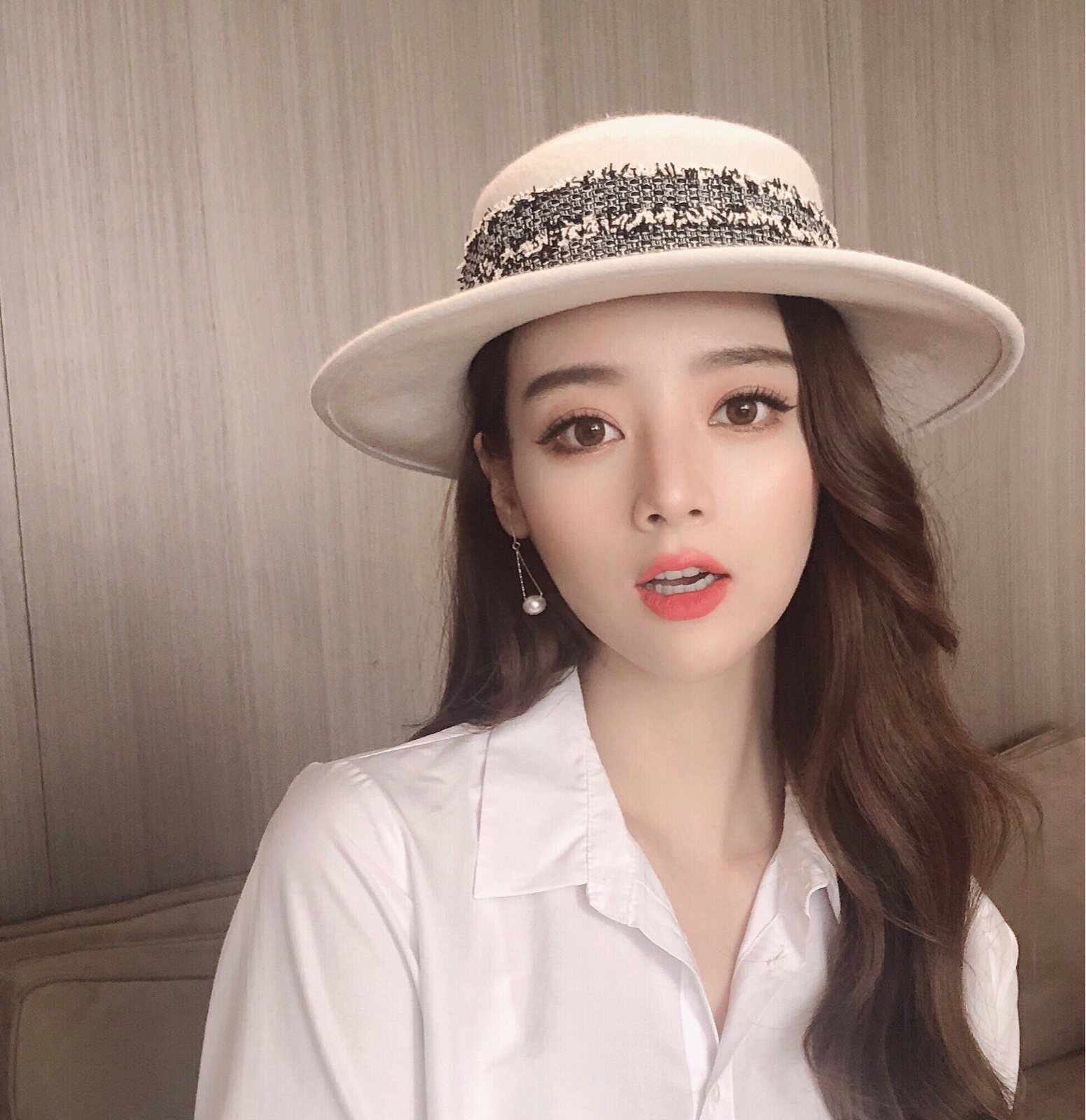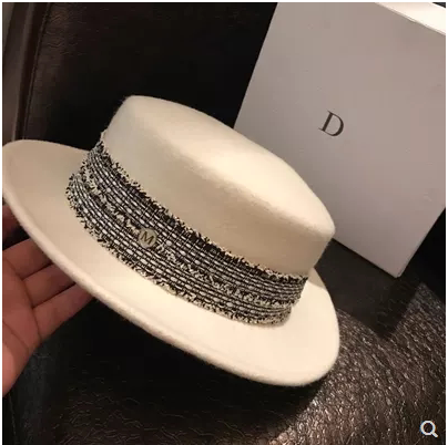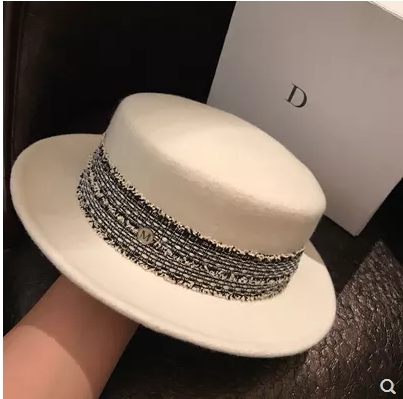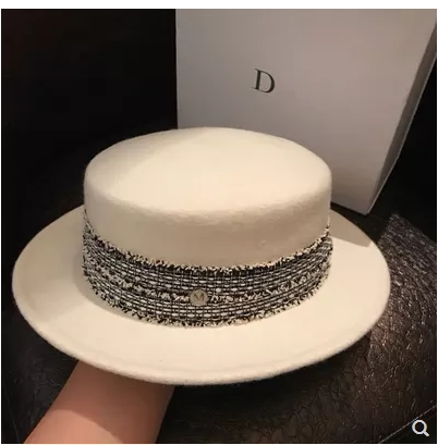 French autumn and winter British ladies tide women white bow flat top wide-brimmed small hat wool felt hat net red