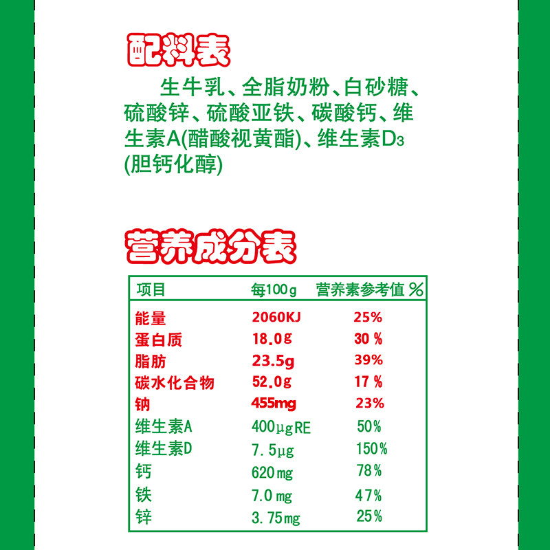 Raw cow's milk full fat milk powder white sugar zinc sulfate ferrous sulfate calcium carbonate vitamin A vitamin D3