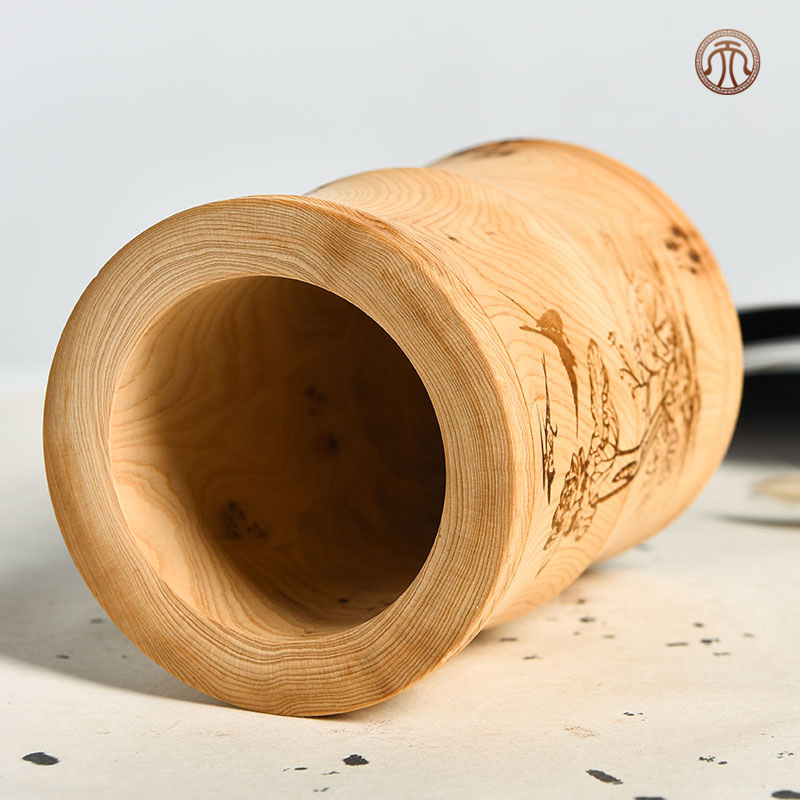 Cliff-carved character pen holder solid wood book house bamboo festival wood carving round pen holder retro office swing piece wood process gift hem decoration