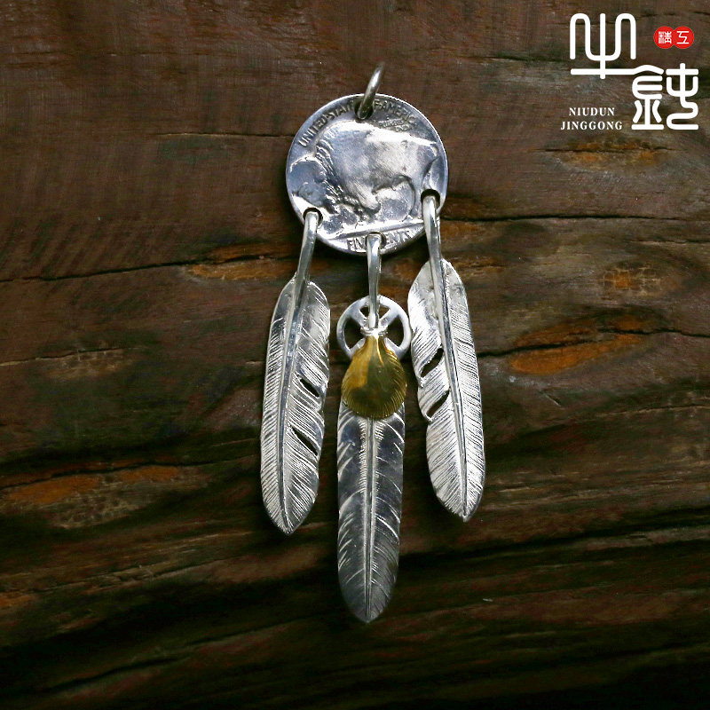 Bull blunt Seiko Takaqiao Indian Five cents feather necklace set with hand - crafted 925 pure silver male and female couples
