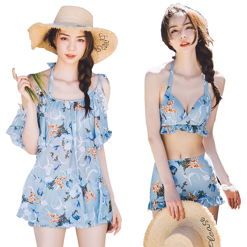 Korean swimsuit women's three-piece bikini sexy two-piece skirt flat angle conservative small chest gathered spa bathing suit