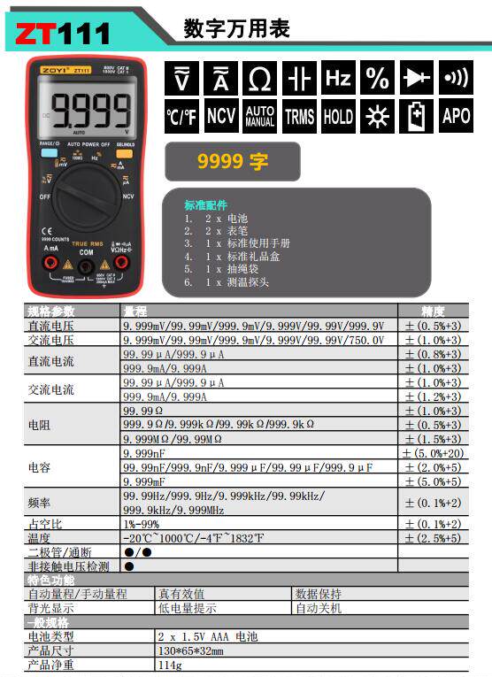 ZOYI ZT111 Handheld automatic range with NCV full 9999 bits small universal meter pocket meter