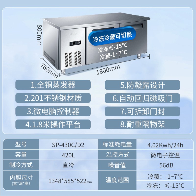Haier Haier 430 liters full copper tube Ice cabinet bench 1 8 m Refrigerated freezing conversion operation table