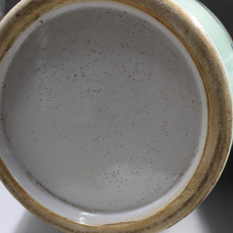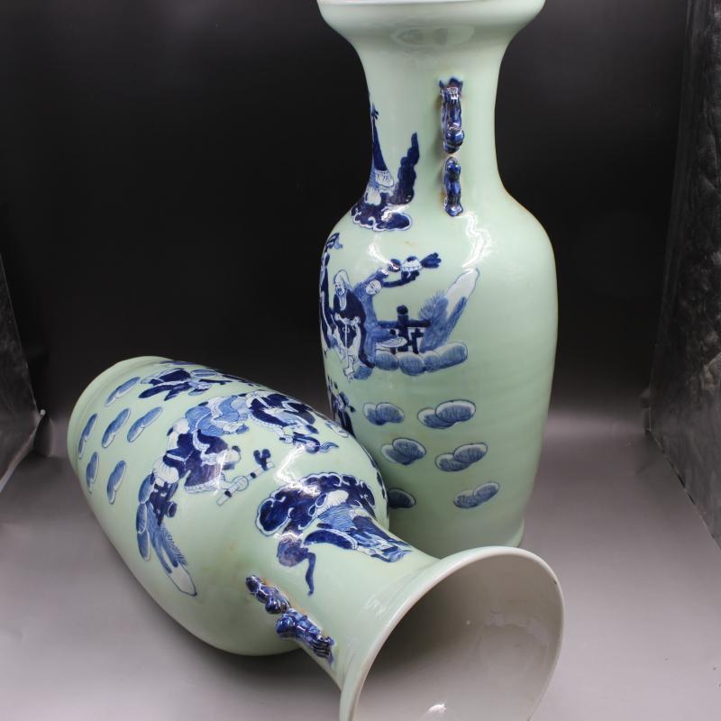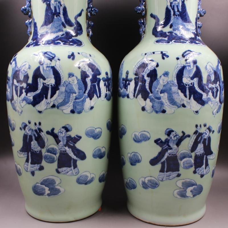 53 Qing Kangxi bean green glaze blue and white figure eight immortals lion ear vase imitation antique porcelain ornament antique collection
