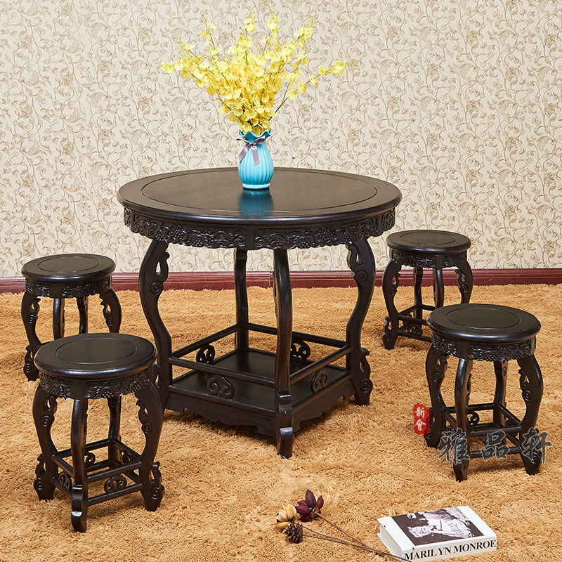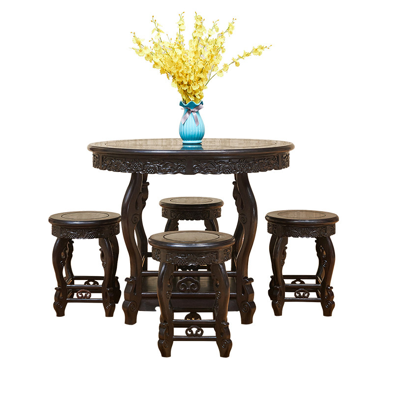 Wood-surfaced round table with 4 benches 98 long (black sandalwood) wooden round table with 6 stools 118 long (black sandalwood) cloud stone round table with 4 stools 98 long (black sandalite) dolock tables with 6 stools