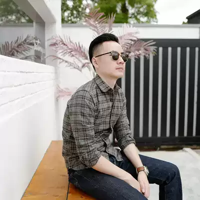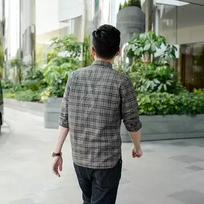 bf original cotton gray black plaid shirt male long sleeve slim round neck casual retro trend handsome youth shirt