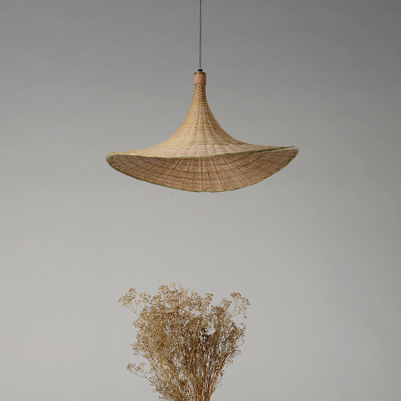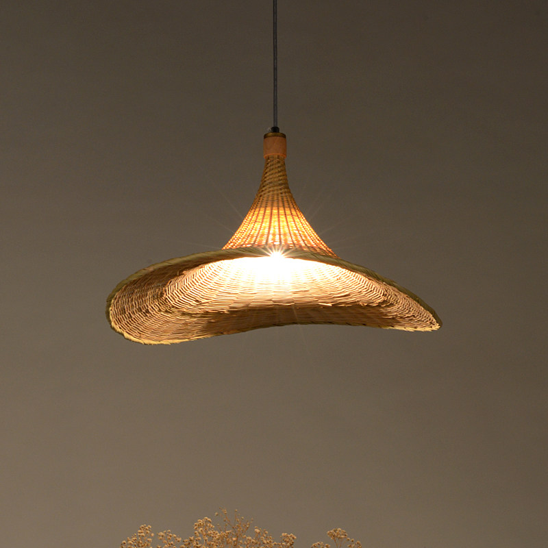 There are wooden bamboo chandelier straw hat lamp restaurant lamps Japanese simple Chinese porch balcony
