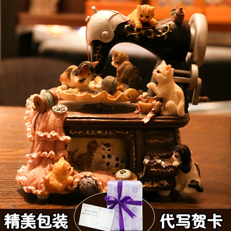 Sewing machine cat music box cartoon retro music box to send girlfriends children Christmas birthday gifts